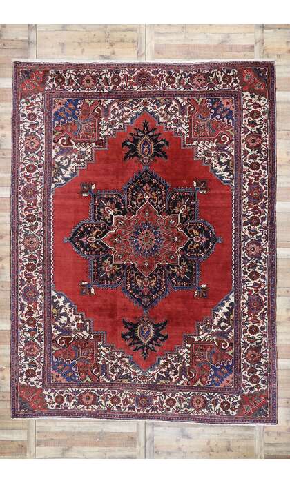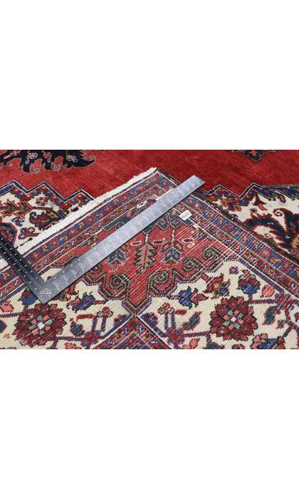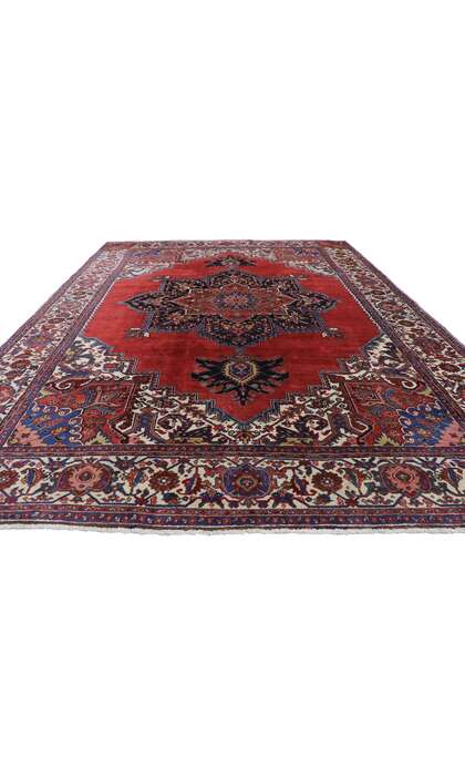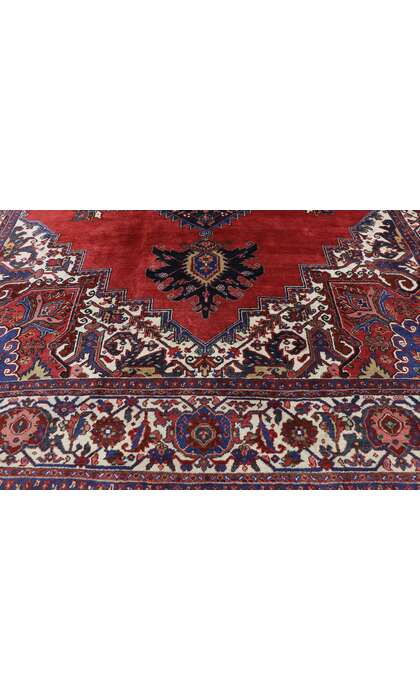 A Persian Heriz rug is a handwoven masterpiece originating from the northwest region of Iran. These rugs are characterized by their rectilinear design, large geometric medallion, tribal motifs, warm colors, and intricate Herati border.
